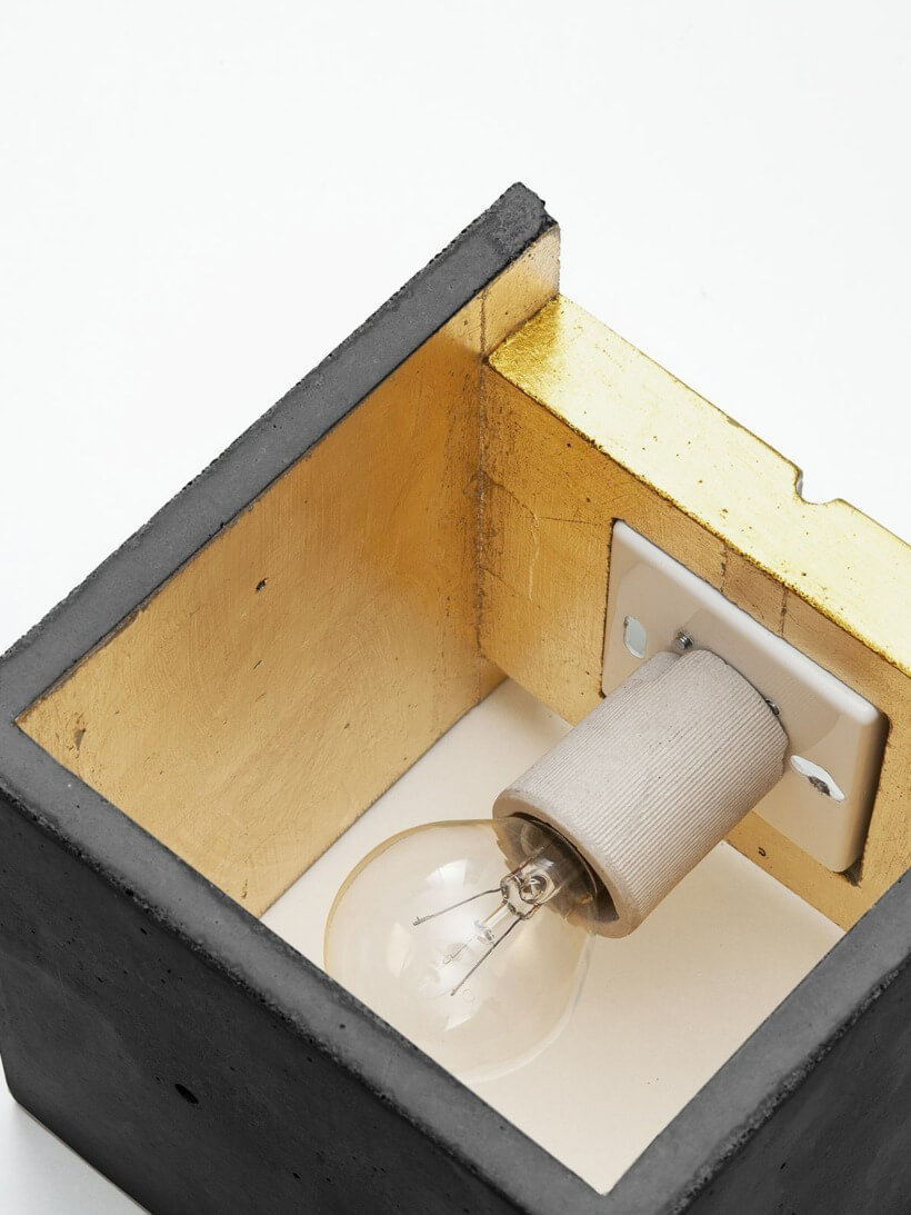 Die kubische Wandlampe [B3]dark wird aus dunkelgrauem Beton gegossen. Sie vereint edles Gold mit rauem Beton zu einer zeitlosen und eleganten Designerleuchte. Durch die hochwertige Vergoldung der Innenseiten gibt sie ein angenehm warmes Licht ab.