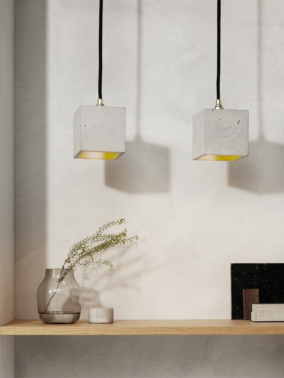 Mit einer Kantenlänge von 10 x 10 x 10 cm eignet sich die Lampe sowohl einzeln als “Hingucker”, aber auch um sie in Reihe über einem Esstisch, einer langen Tafel, einem Sideboard, einem Tresen, einer Bar oder frei im Raum in Szene zu setzen. Auf Grund ihres minimalistischen Designs und den kontrastreichen Materialien: Beton und Gold, Silber oder Kupfer, lässt sich die Leuchte mit jedem Einrichtungsstil kombinieren.