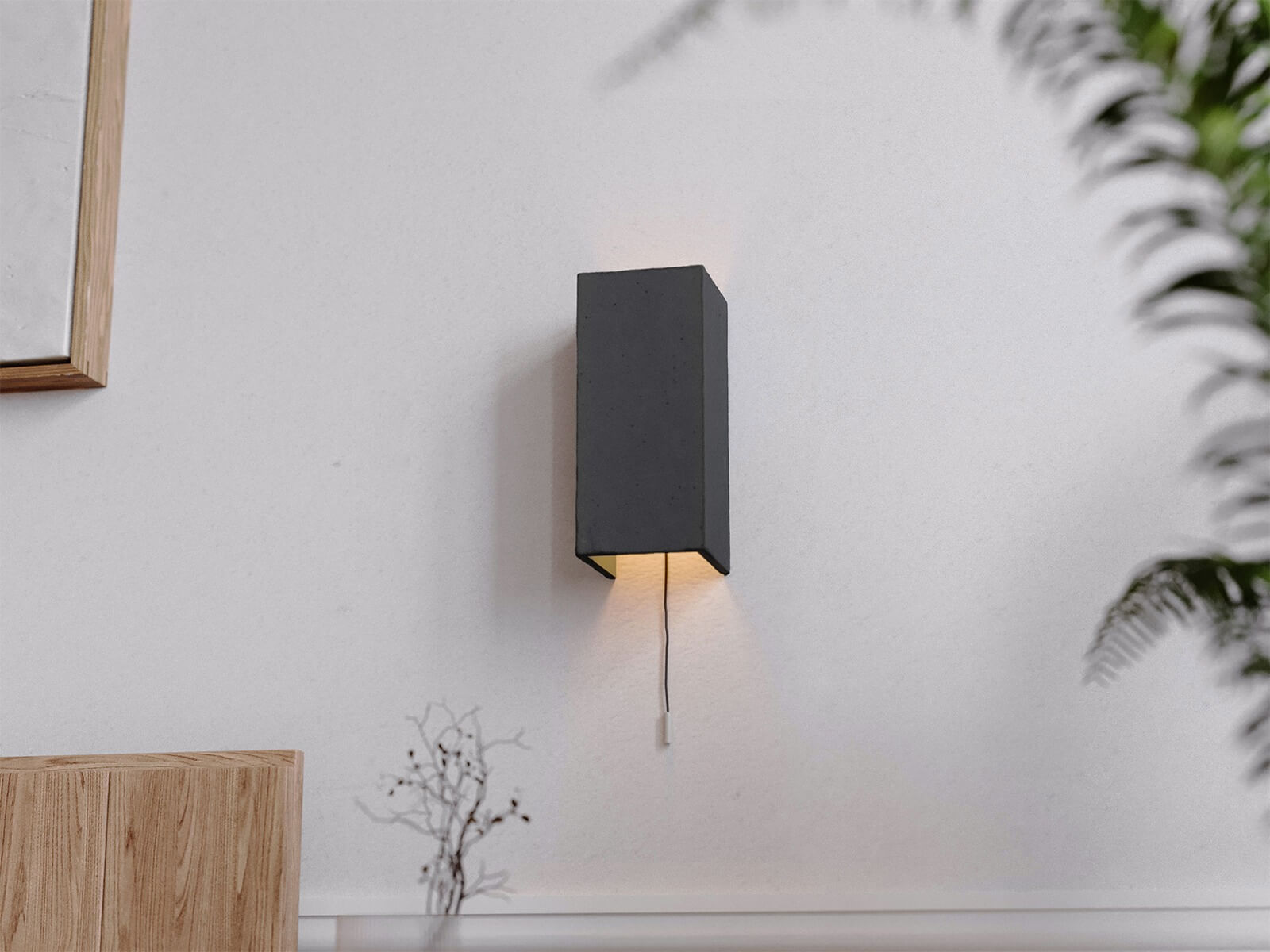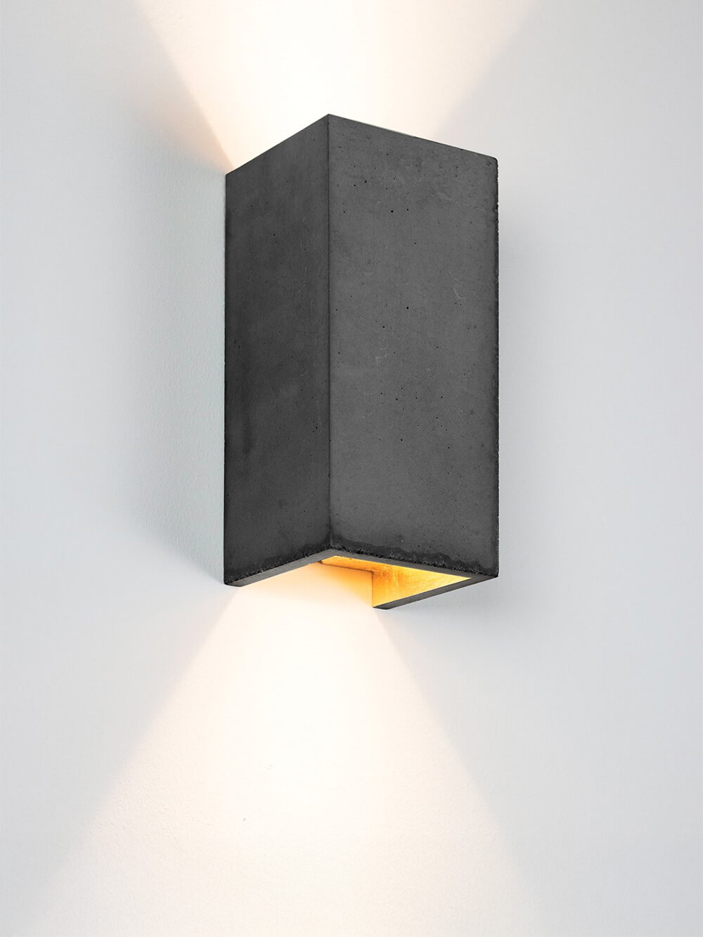 Die rechteckig Wandlampe [B8] dark wird aus dunkelgrauem Beton gegossen. Sie vereint edles Gold mit rauem Beton zu einer zeitlosen und eleganten Designerleuchte. Durch die hochwertige Vergoldung der Innenseiten gibt sie ein angenehm warmes Licht ab.