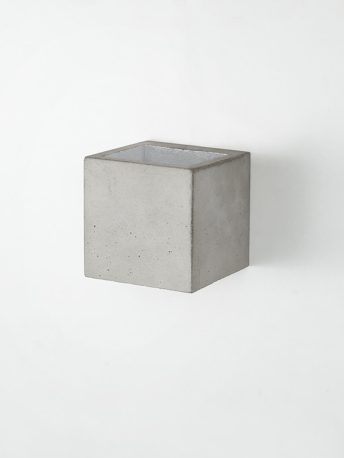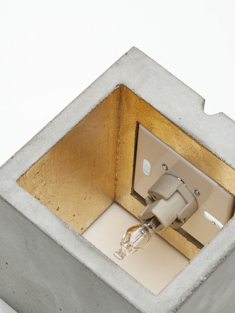 Die quadratische Wandlampe [B9] wird aus grauem Beton gegossen. Sie vereint edles Gold mit rauem Beton zu einer zeitlosen und eleganten Designerleuchte. Durch die hochwertige Vergoldung der Innenseiten gibt sie ein angenehm warmes Licht ab.