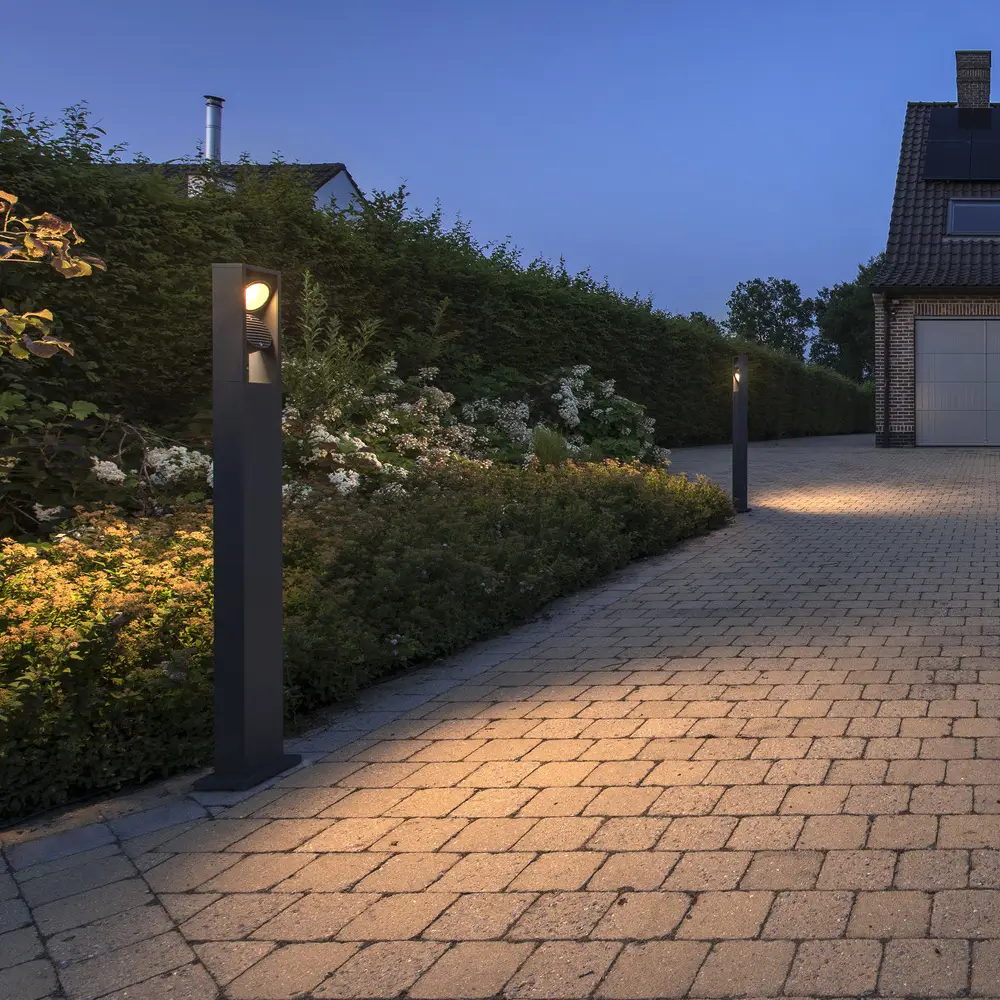 Die ESKINA FRAME LED-Standleuchte in der „Double“-Ausführung erweitert das architektonische Design der ESKINA-Familie um eine zweite Lichtquelle. Die beiden unabhängig voneinander drehbaren Leuchtenköpfe ermöglichen es, Lichtakzente in unterschiedliche Richtungen zu setzen – ideal für die gleichzeitige Beleuchtung von Wegen und angrenzenden Gartenflächen. In einem anthrazitfarbenen Aluminium-Rahmen gefasst, vereint die Leuchte moderne Ästhetik mit technischer Flexibilität. Über den integrierten CCT-Switch lässt sich auch hier die Lichtfarbe (3000/4000 K) vor der Installation individuell anpassen. Dank IP65-Zertifizierung ist sie perfekt gegen Umwelteinflüsse geschützt und bietet eine langlebige, stilvolle Lösung für anspruchsvolle Außenanlagen.