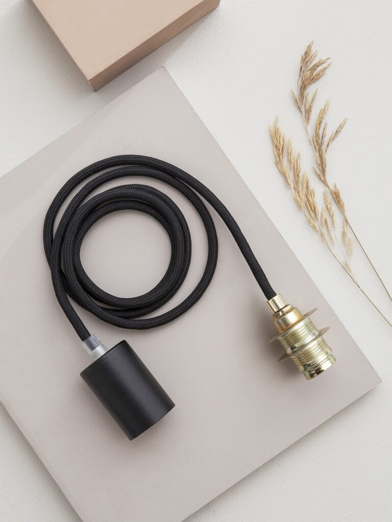 Der Lieferumfang beinhaltet eine Anleitung, den handgefertigten Lampenschirm aus Beton und die von einem geprüften Elektriker aus CE zertifizierten Bauteilen hergestellte Fassungskonfiguration. Diese besteht aus einer E14-Messingfassung mit Zugentlastung, einem Textilkabel sowie dem benötigten Befestigungsmaterial und einem Metall-Baldachin.