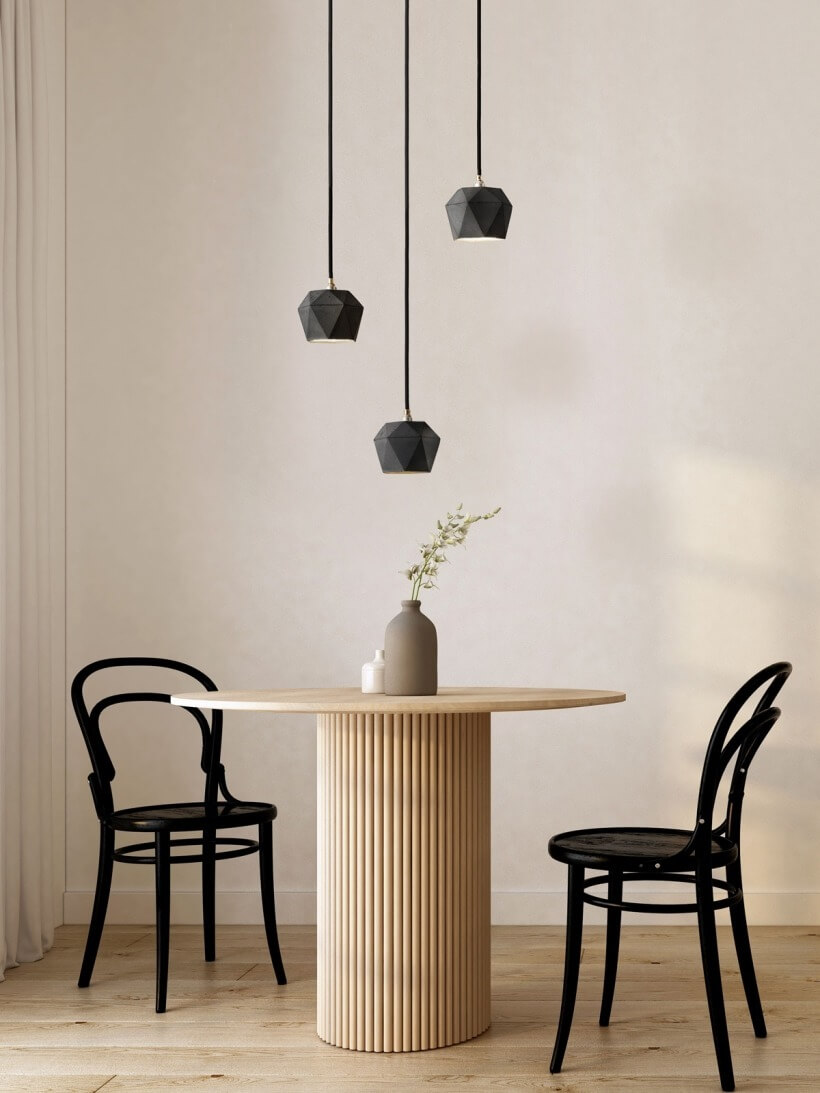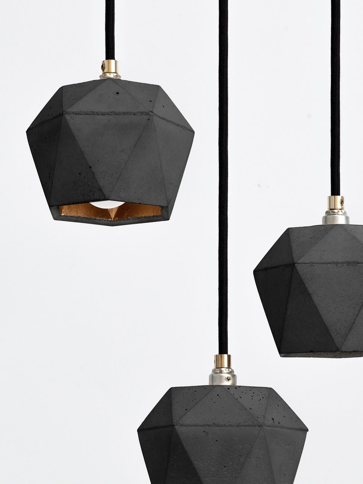 Die triangulierten Lampenschirme vom [T2]set werden aus dunkelgrauem Beton gegossen. Sie vereinen edles Gold mit rauem Beton zu einer zeitlosen und außergewöhnlichen Designerleuchte. Durch die hochwertige Beschichtung der Innenseiten gibt sie ein angenehm warmes Licht ab. Das Set ist mit 2, 3, 5 oder 7 Lampenschirmen erhältlich. Die Fassungen werden passend dazu mit Baldachinen mit den entsprechenden Kabelauslässen geliefert. Diese Pendelleuchte eignet sich besonders gut für die Beleuchtung über dem Esstisch und sorgt für eine gleichmäßige Ausleuchtung der Tischfläche.