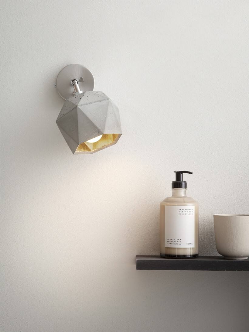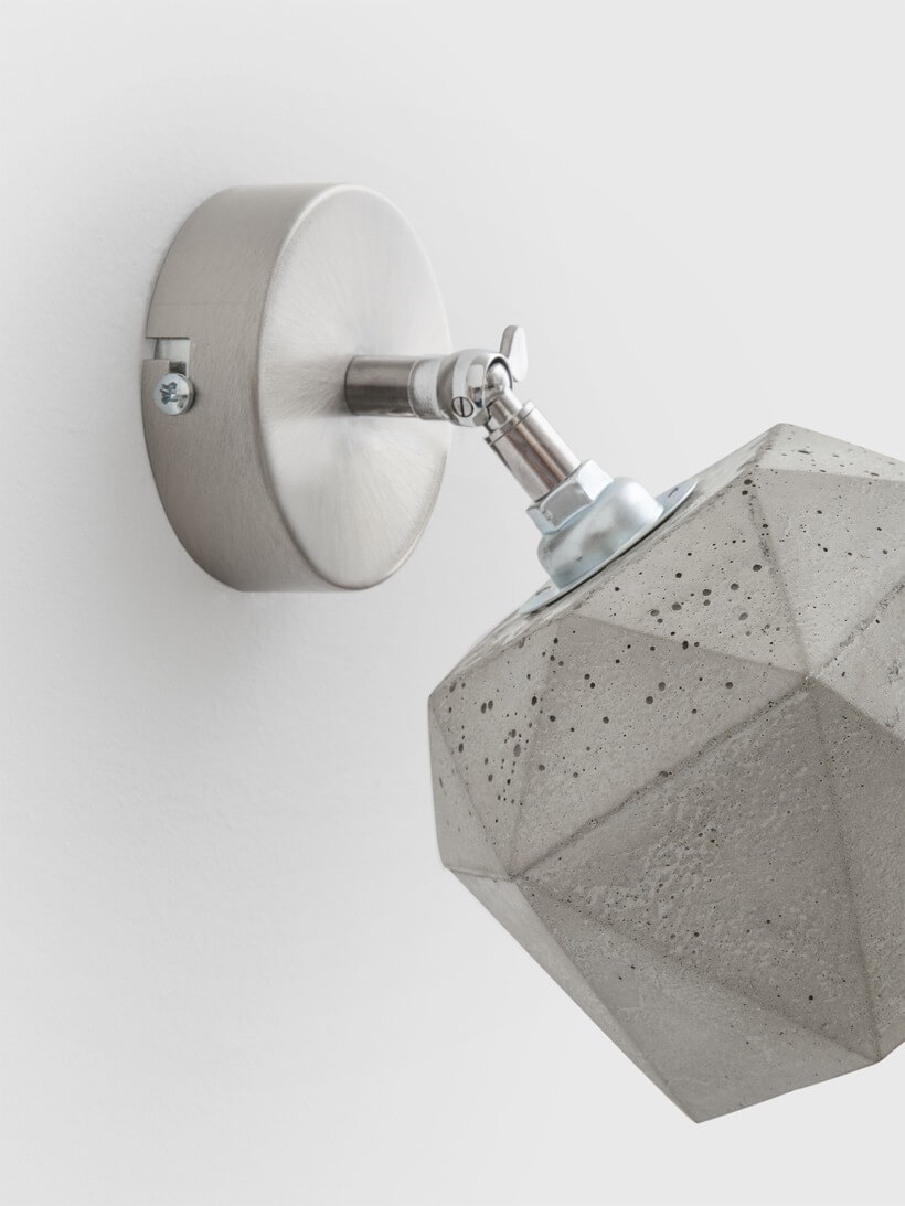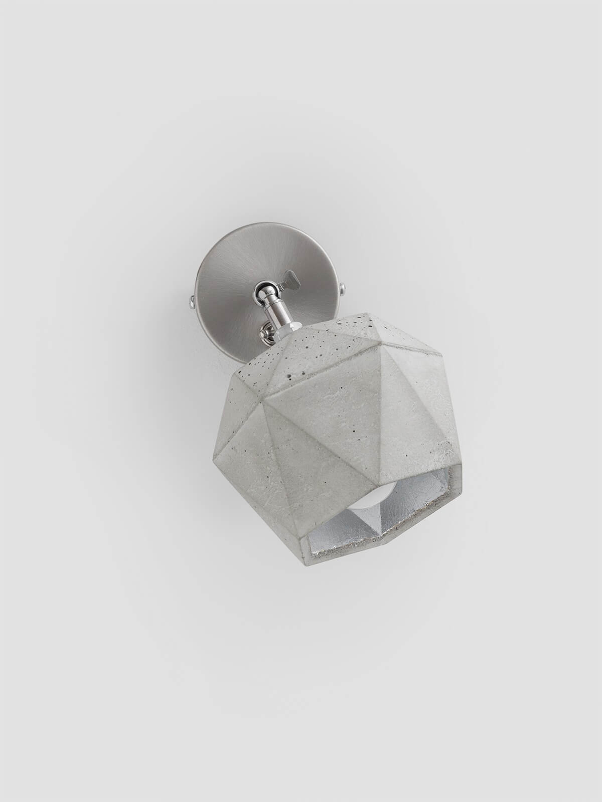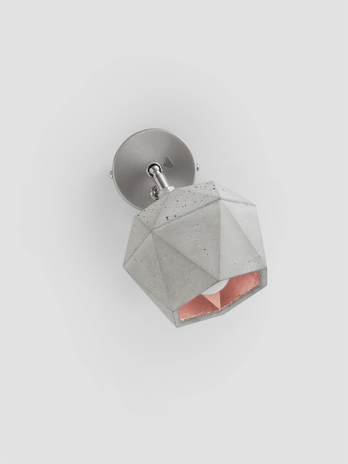 Die triangulierte [T2] spot Wandleuchte wird aus hellgrauem Beton gegossen. Sie vereint edles Gold mit rauem Beton zu einer zeitlosen und außergewöhnlichen Designerleuchte. Durch die hochwertige Beschichtung der Innenseiten gibt sie ein angenehm warmes Licht ab.