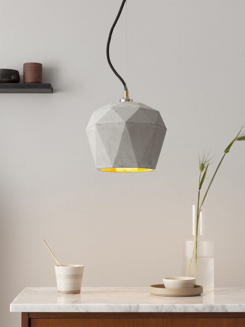 Die triangulierte Hängeleuchte [T3] wird aus grauem Beton gegossen. Sie vereint edles Gold mit rauem Beton zu einer zeitlosen und außergewöhnlichen Designerleuchte. Durch die hochwertige Beschichtung der Innenseiten gibt sie ein angenehm warmes Licht ab.
