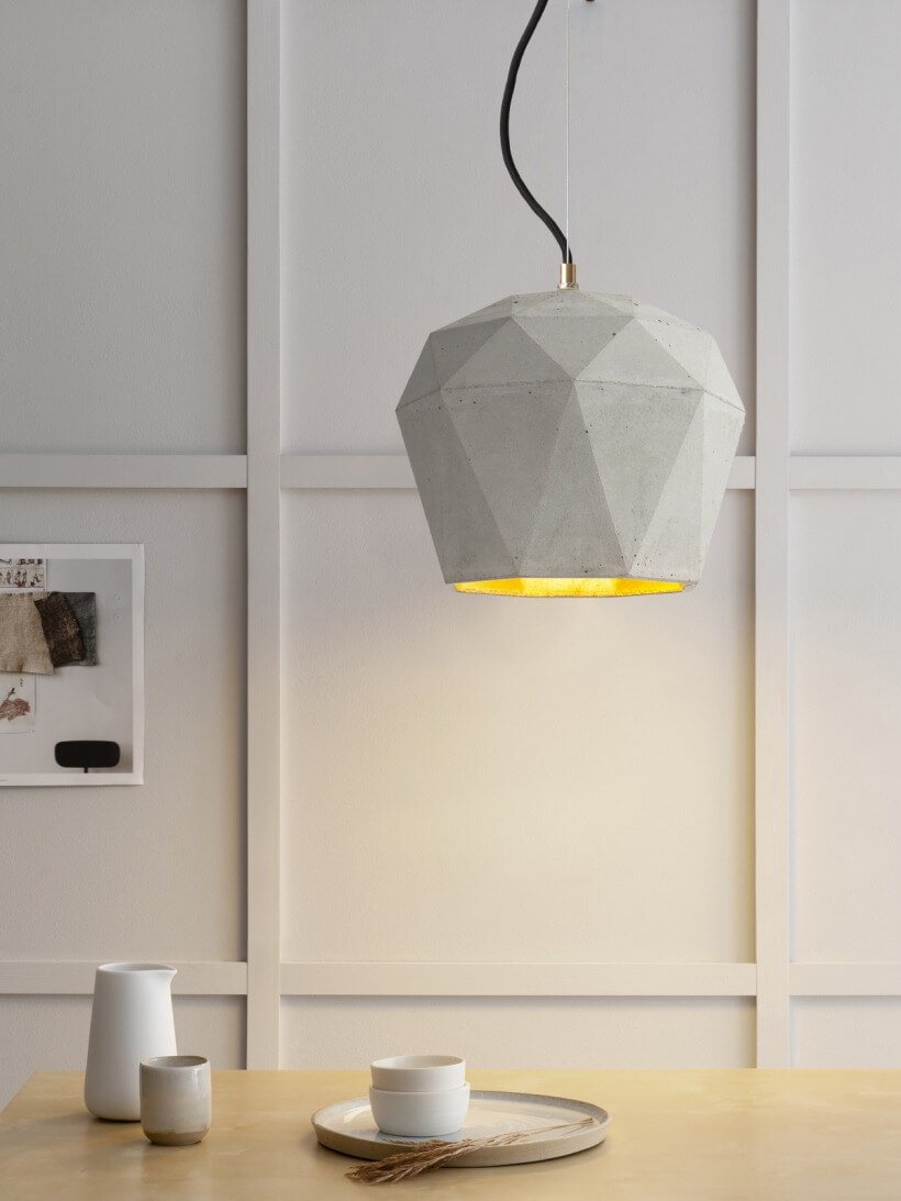 Die triangulierte Hängeleuchte [T4] wird aus grauem Beton gegossen. Sie vereint edles Gold mit rauem Beton zu einer zeitlosen und außergewöhnlichen Designerleuchte. Durch die hochwertige Beschichtung der Innenseiten gibt sie ein angenehm warmes Licht ab.